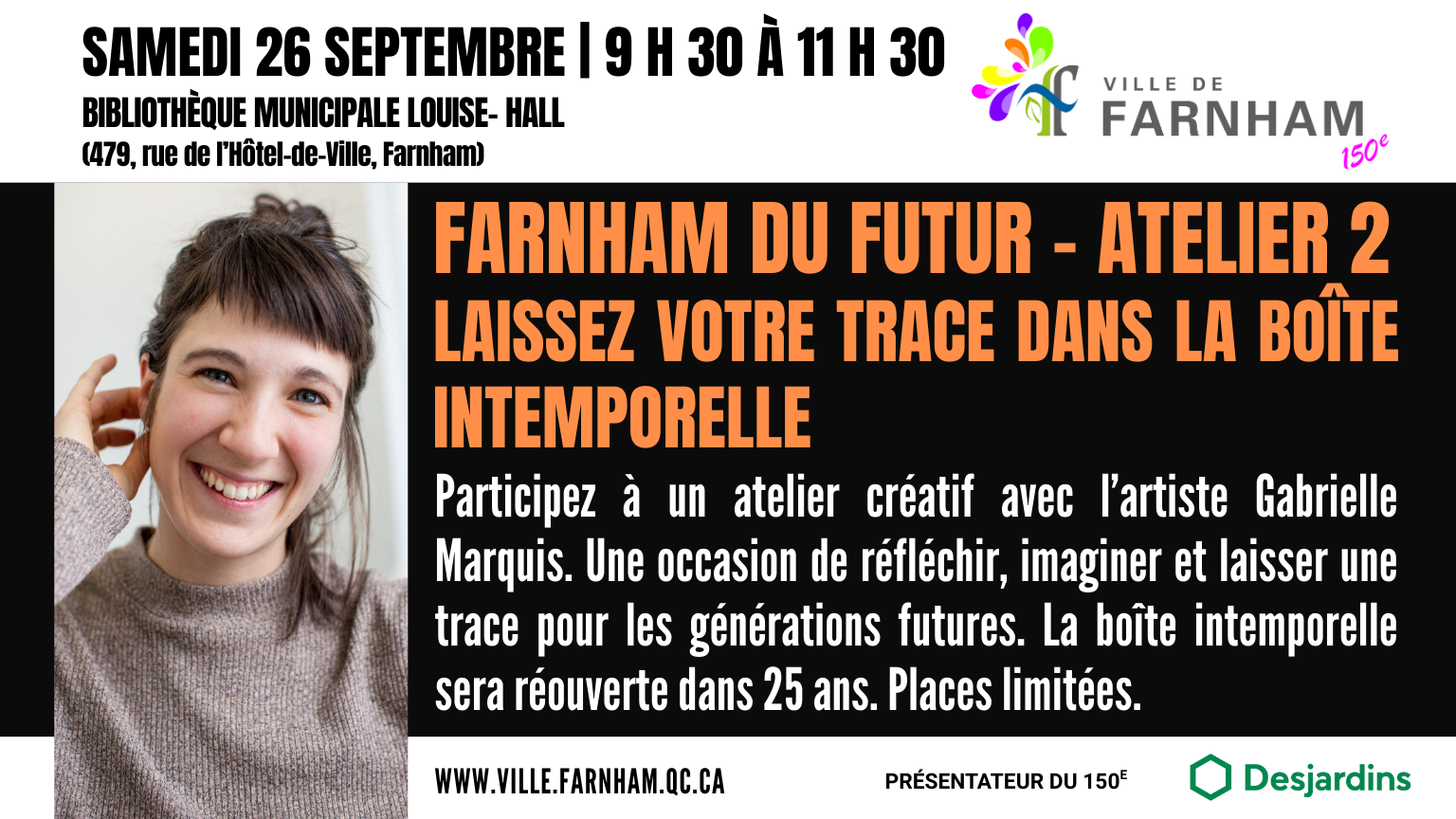 Dans le cadre des célébrations du 150e anniversaire de Farnham, participez à un atelier créatif unique où vos œuvres voyageront dans le temps! Guidés par l’artiste multidisciplinaire Gabrielle Marquis, vous explorerez différentes techniques artistiques pour concevoir des éléments qui racontent votre Farnham d’aujourd’hui.