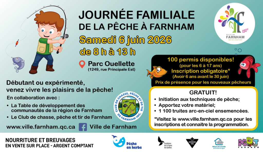 En collaboration avec la Table de développement des communautés de la région de Farnham, le Club de chasse, pêche et tir de Farnham, ainsi que la Fondation de la faune du Québec, la Ville de Farnham vous invite à participer à la Journée familiale de la pêche.