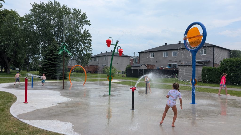 Le site se distingue également par son intégration harmonieuse à l’environnement naturel du parc, notamment grâce à la présence d’arbres matures qui procurent des zones d’ombre très appréciées lors des journées chaudes. La Ville a mandaté la compagnie Jeux-Tech pour procéder à l’installation des jeux d’eau, conçus par la compagnie Waterplay. Le concept privilégie un grand espace ouvert, où les différents modules sont suffisamment espacés pour faciliter l’accès à tous, y compris aux personnes à mobilité réduite. Une portion de la surface est davantage axée sur les enfants, avec des modules colorés et dynamiques, tandis qu’une autre section met l’accent sur le rafraîchissement grâce à des anneaux de brume.